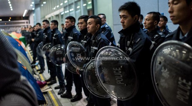 Around 100 police used pepper spray and batons as they battled hundreds of protesters, some in helmets and waving umbrellas — a symbol of their movement — in an angry confrontation that broke out in the early hours. Officers made six arrests.
